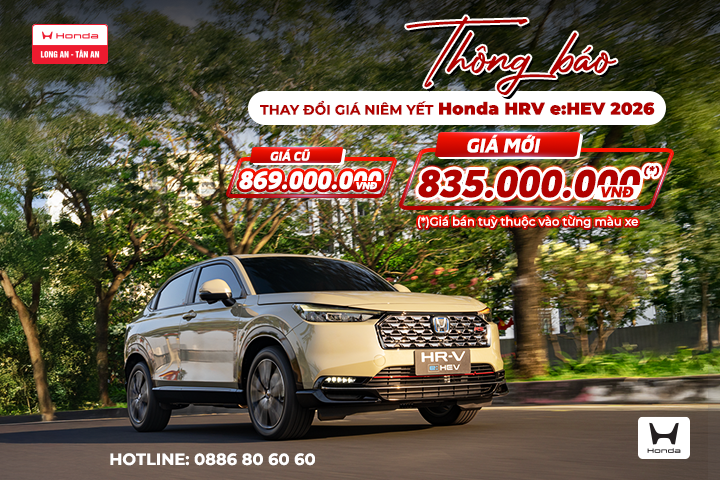 Honda Ô tô Long An trân trọng thông báo mẫu Honda HR-V e:HEV 2026 đã chính thức thay đổi giá niêm yết từ 869 triệu đồng xuống còn 835 triệu đồng (tùy màu xe).
