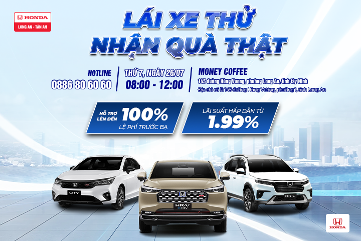 Honda Ôtô Long An trân trọng mời Quý khách hàng tham gia sự kiện “Lái thử xe – Nhận quà thật” diễn ra tại Tây Ninh. Đây là cơ hội tuyệt vời để trực tiếp trải nghiệm cảm giác lái của các mẫu xe Honda đang được ưa chuộng nhất hiện nay.