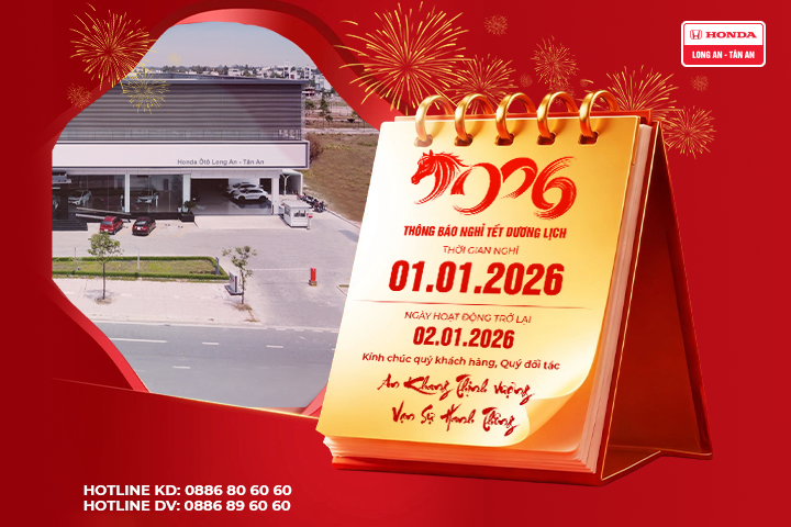 Nhằm tạo điều kiện cho Quý Khách Hàng liên hệ sử dụng Dịch Vụ nhân dịp Tết Dương lịch 2026, Honda Ô tô Long An – Tân An trân trọng thông báo lịch nghỉ như sau: