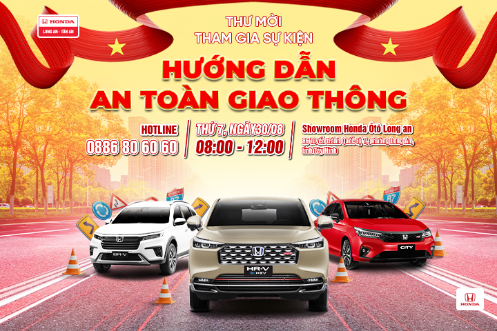 Honda Ôtô Long An trân trọng kính mời Quý Khách hàng tham dự chương trình Hướng dẫn An toàn Giao thông & Lái xe An toàn diễn ra vào lúc 08h00 – 12h00, ngày 30/08/2025 tại Showroom Honda Ôtô Long An.